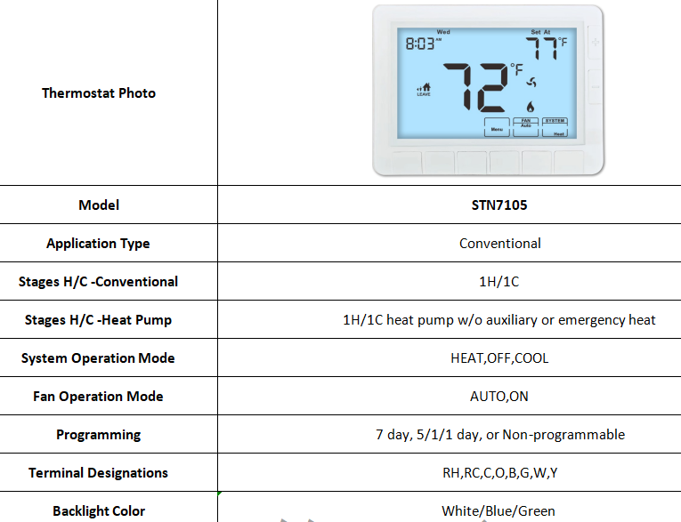 STN7105 เป็นเครื่องควบคุมเทอร์โมสเตตดิจิตอลที่มีความหลากหลาย ซึ่งเข้ากันได้กับระบบทําความร้อนและทําความเย็นแบบปกติมันสนับสนุนการตั้งค่าปั๊มความร้อน 1H / 1C โดยไม่มีความร้อนเสริมหรือฉุกเฉิน, ทําให้มันเป็นตัวเลือกเทอร์โมสแตตเครื่องยนต์ที่มีประสิทธิภาพสําหรับการตั้งค่า HVAC ต่าง ๆ