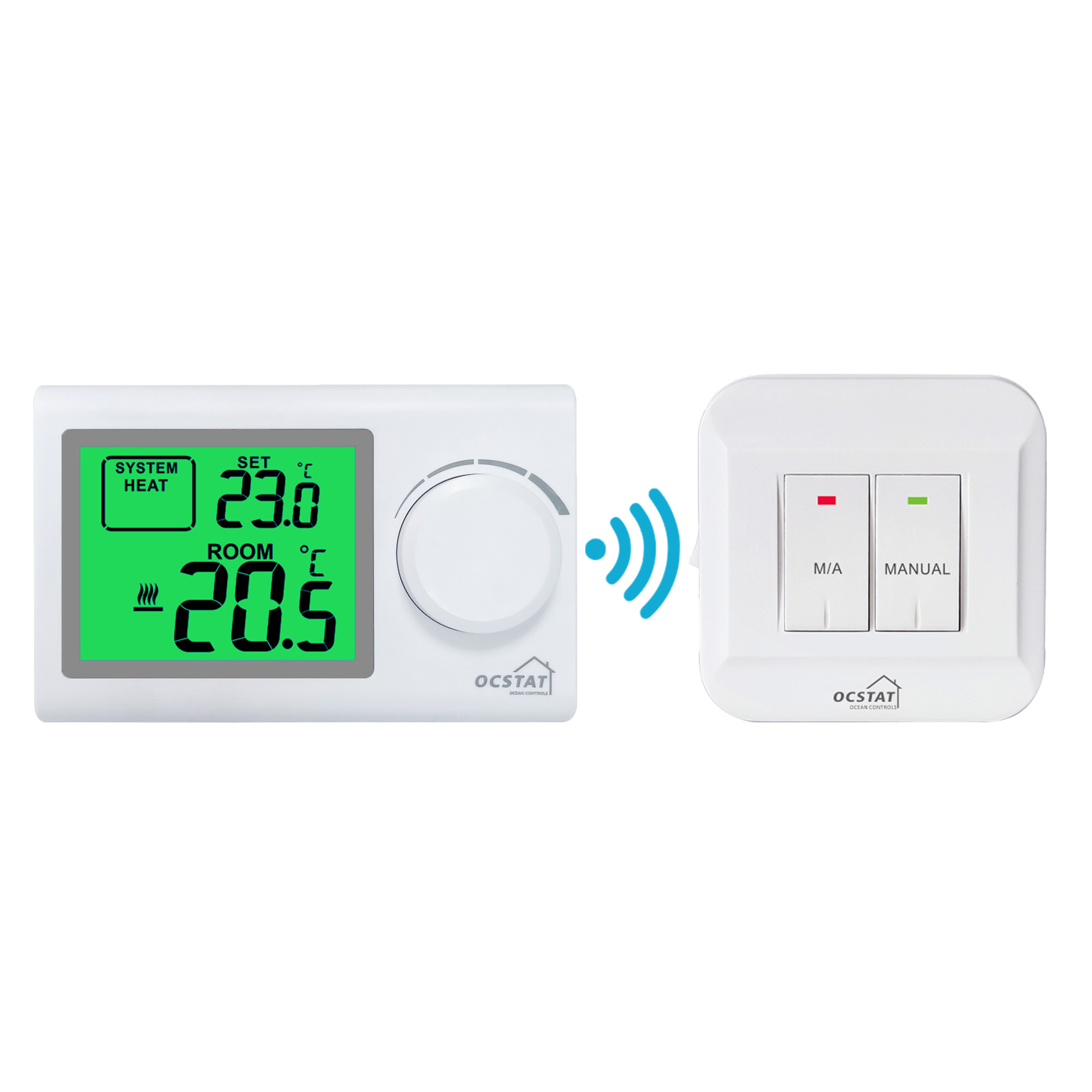 A1: The wireless room thermostat is from the brand OCSTAT, and the model number is ST2401RF.